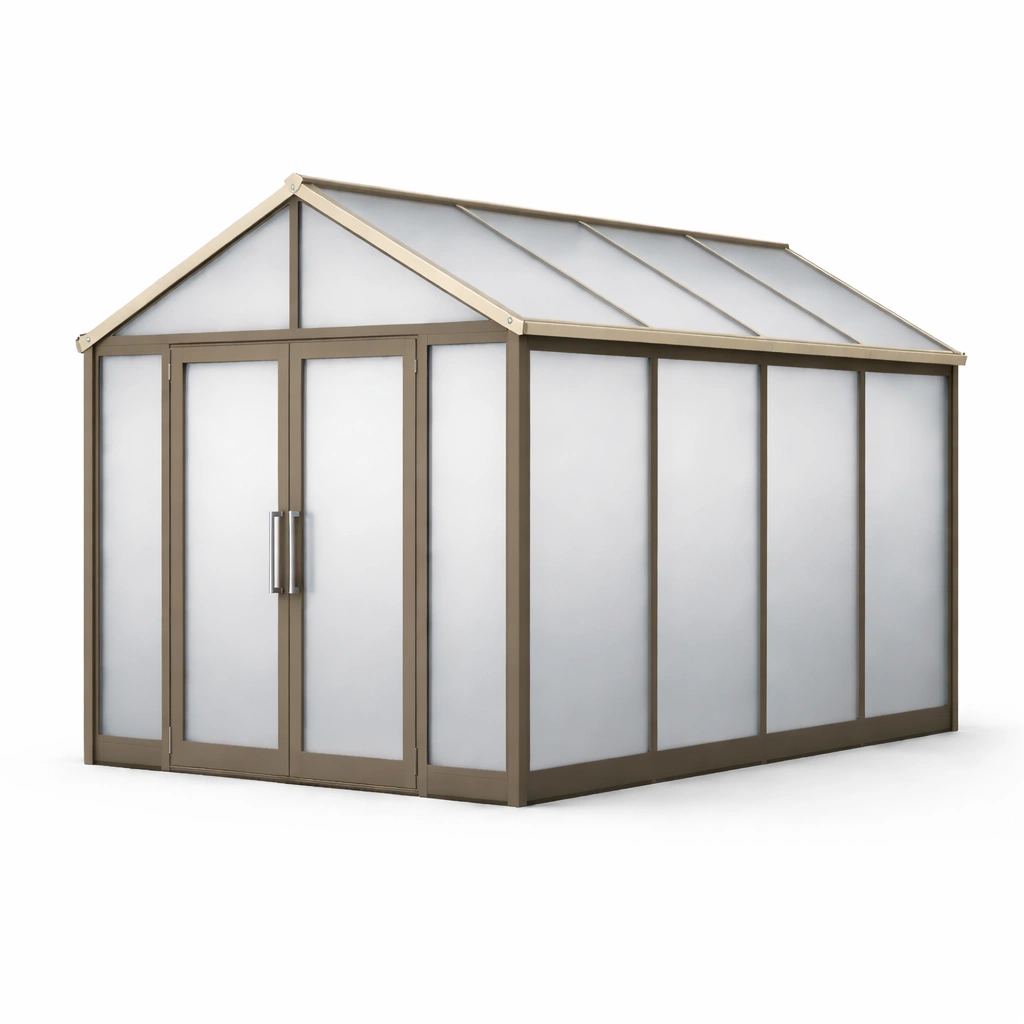 Das Gewächshaus besteht aus einem stabilen Aluminiumrahmen und 4 mm starken Polycarbonatplatten. Die Aluminiumstruktur bietet eine langlebige Lösung für den Außeneinsatz. Die Wände aus Polycarbonat sorgen für hervorragende Lichtdurchlässigkeit und schützen die Pflanzen vor Witterungseinflüssen.